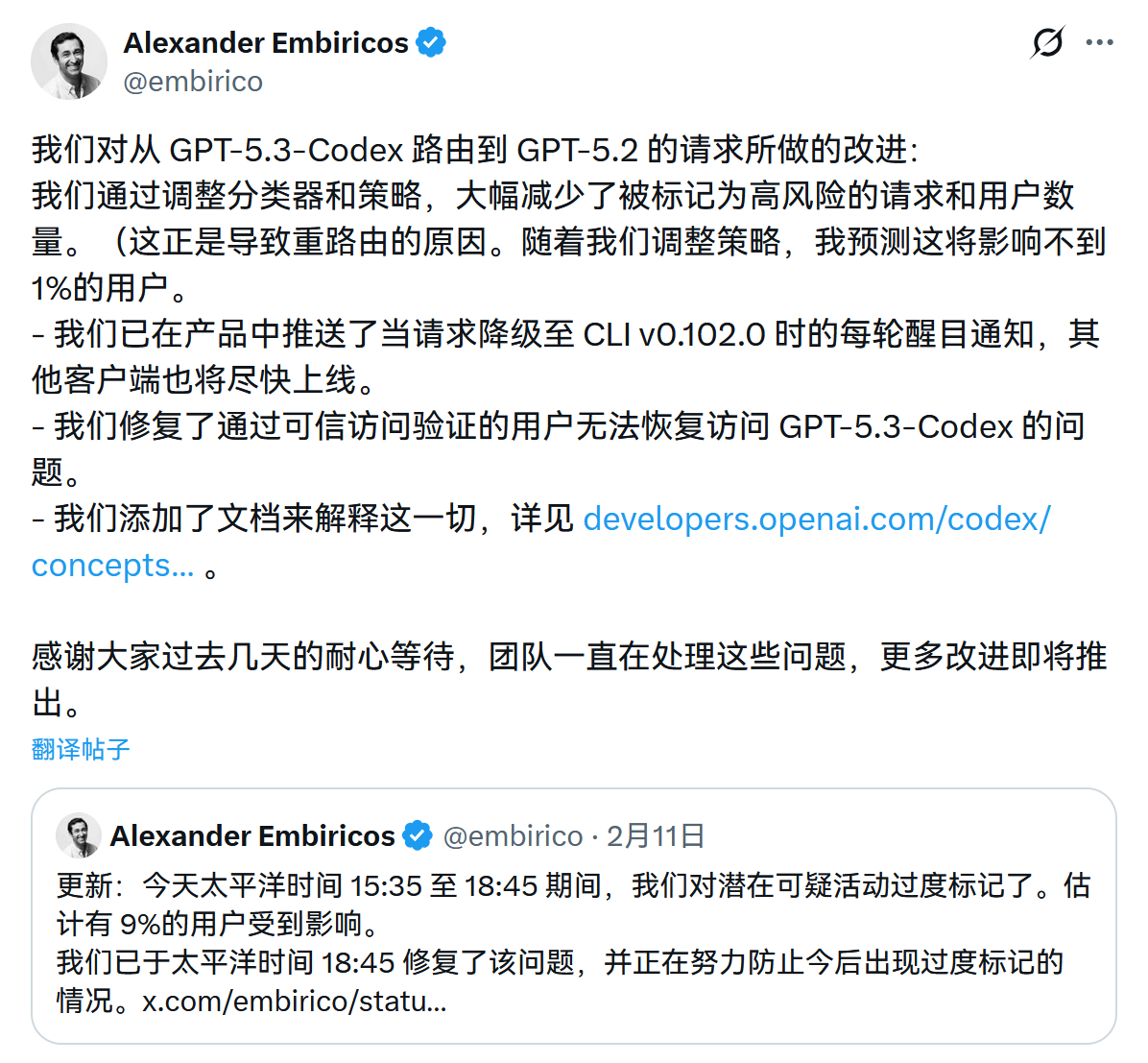 GPT-5.3-Codex却被路由至GPT-5.2的问题,OpenAI 称已修复相关Bug并校准了分类器,同时在CLIv0.102.0 版本中加入了显眼的降级通知功能。