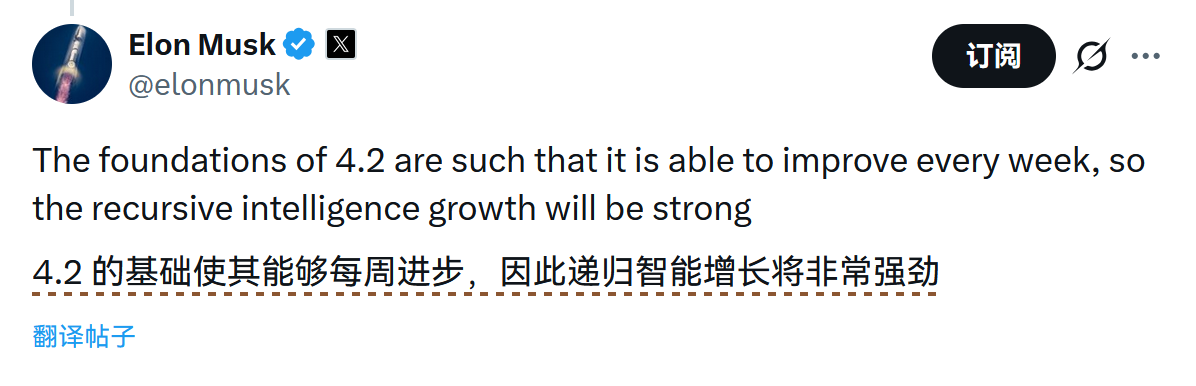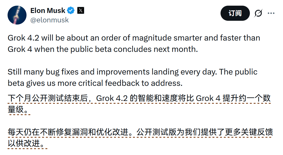 xAI上线了Grok 4.20公开测试版,用户需在应用内手动选择。据创始人Elon Musk透露,该模型并非单纯迭代,而是基于500B参数的V8小型基础模型构建。官方声明指出,Grok 4.2基础设施支持快速学习与每周更新,以实现“递归智能增长”。官方预计,在下个月测试版结束时,其智能水平和速度将比Grok 4提升约一个数量级。