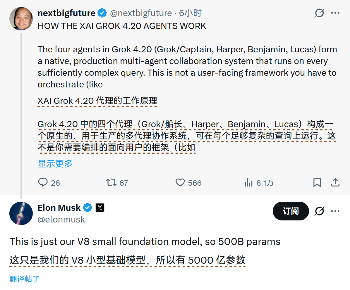 Grok 4.20公开测试版,该版本引入了由四个Agent组成的原生协作系统,用于处理复杂查询。据 Elon Musk 称,该版本基于 5000 亿参数的V8模型,凭借快速学习与每周迭代,下个月测试结束时,其智能水平和速度预计将比Grok 4提升约一个数量级。