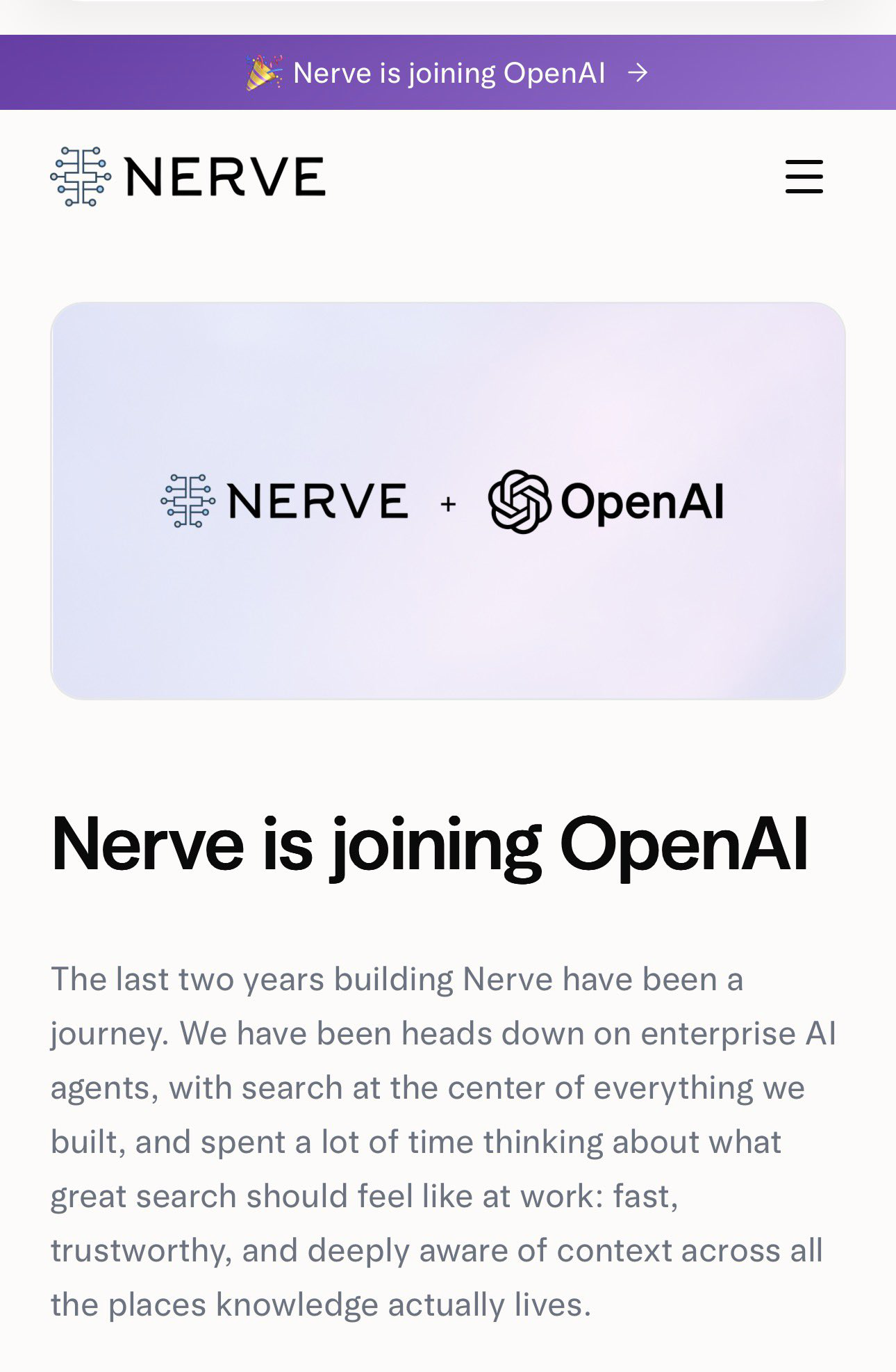初创公司 Nerve 宣布加入 OpenAI,团队将致力于在更大规模上为 ChatGPT 构建搜索功能。