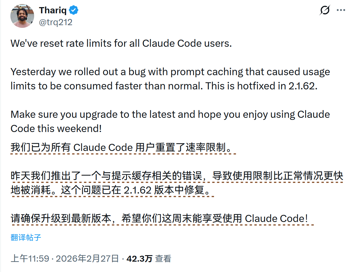Anthropic 官方已重置所有 Claude Code 用户的 Rate Limits,以修复因 Prompt Caching 功能 Bug 导致的额度消耗过快问题。该故障已在 2.1.62 版本中通过热修复解决,官方建议用户立即执行 claude update 命令升级至最新版本,确保额度计算恢复正常。