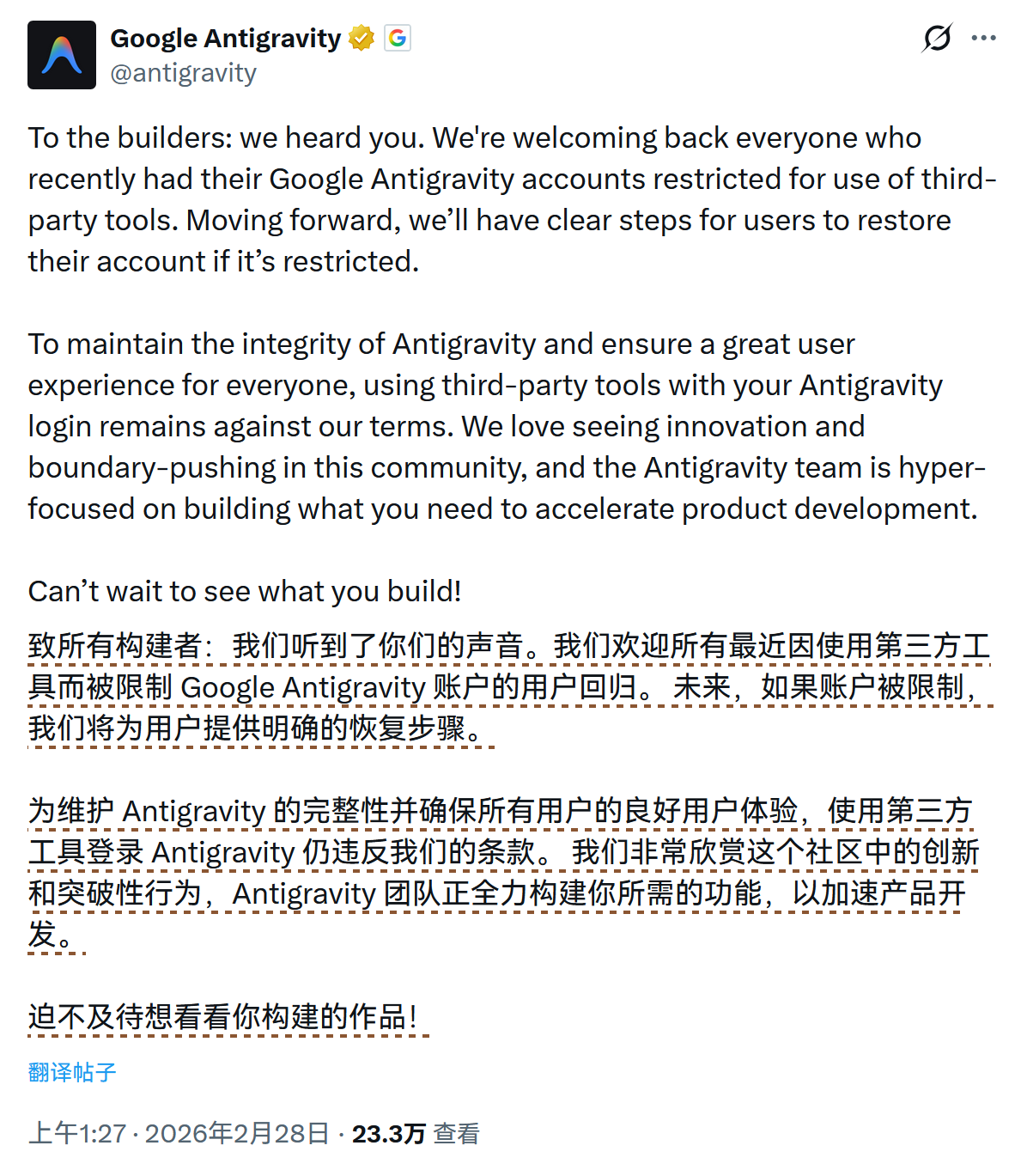 Google Antigravity 恢复部分账户但重申禁用第三方工具 #2