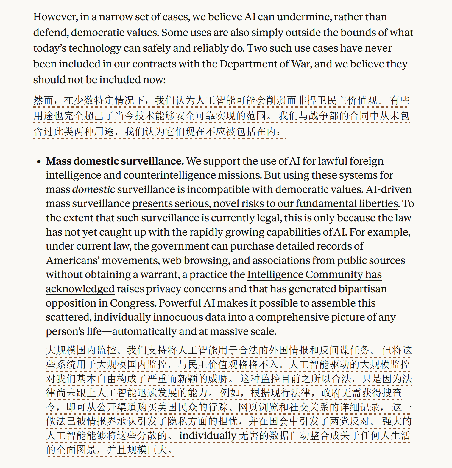 Anthropic因拒绝解除针对“大规模国内监控”和“完全自主武器”的AI安全限制,与美国战争部爆发冲突。CEO Amodei声明,即便面临被列为供应链风险等威胁,公司绝不妥协。