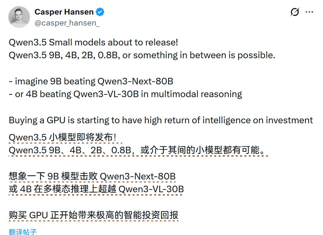 Qwen团队暗示即将发布 Qwen 3.5 系列小参数量的多款模型。据社交媒体上的传闻,可能包括四款模型,参数量分别为