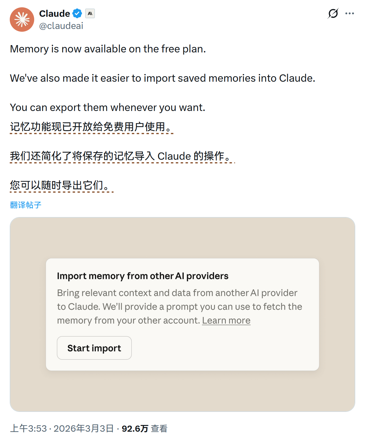 Anthropic 正式向免费用户开放了 Claude 的记忆功能,同时支持用户导出记忆,或从其他 AI 聊天机器人导入记忆。