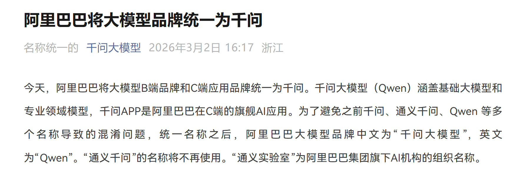 此外,有行业分析认为,阿里巴巴此次统一品牌旨在通过品牌降维与认知聚合,强化其在开源生态与C端市场的领导地位。随着Qwen 3.5体系的完善,这种从技术领先向品牌生态化的转型,或将重塑国内大模型行业的竞争格局。