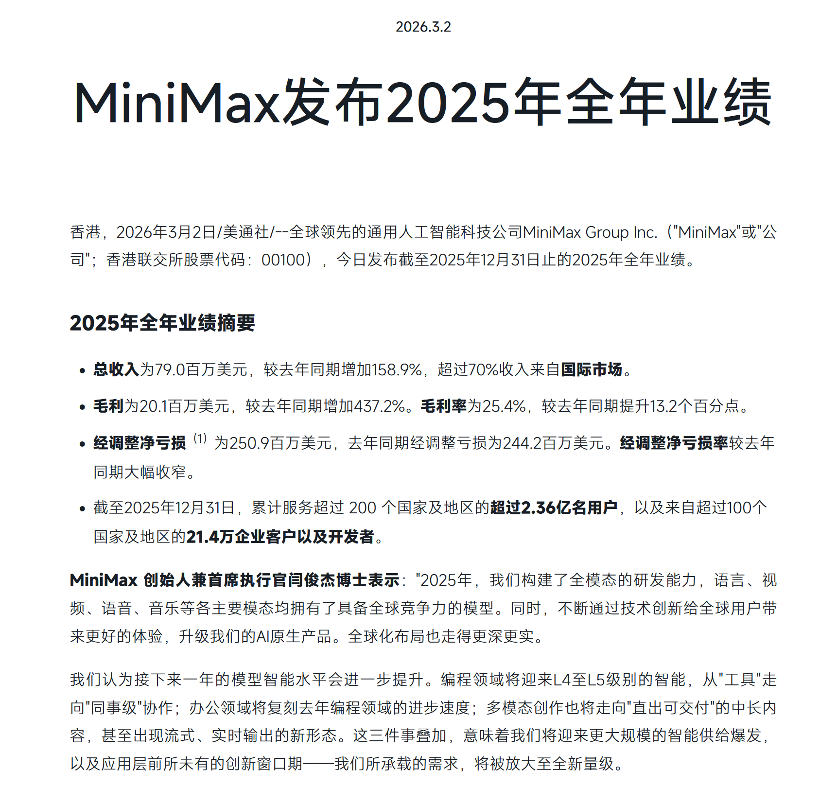 MiniMax(00100.HK)发布上市后首份年报,2025年总收入7903.8万美元,同比增长158.9%,超70%收入源自国际市场。公司毛利增至2010万美元,毛利率提升至25.4%,经调整净亏损2.509亿美元,亏损率同比显著收窄。官方称已完成全模态布局,累计服务用户超2.36亿,最新发布的M2.5模型编程效率提升37%且成本大幅降低。CEO闫俊杰透露截至2026年2月公司ARR已超1.5亿美元,Notion已集成其模型。未来MiniMax将向AI平台型公司迈进。