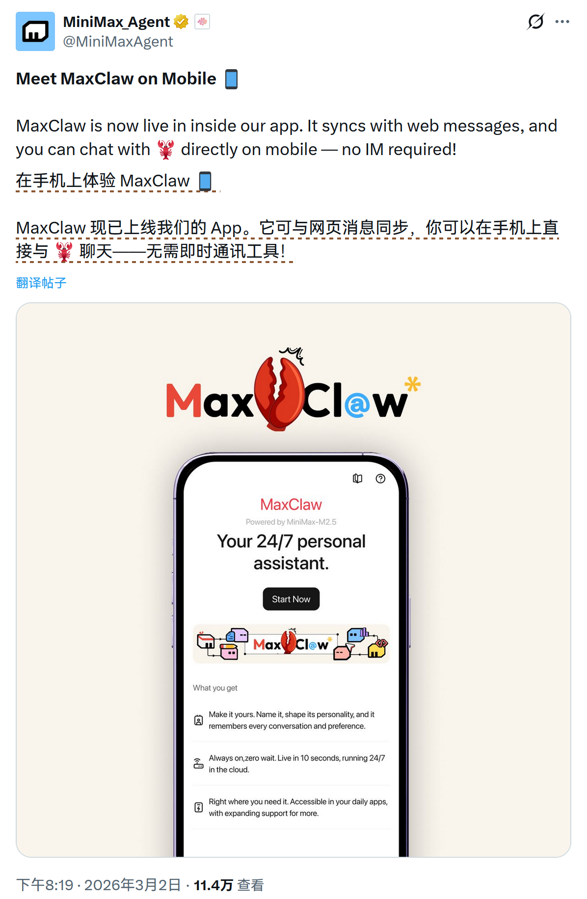 MiniMax 官方宣布移动端 App 上线 MaxClaw 功能,支持 Web 端消息同步,用户可直接与 Agent 交互,无需依赖即时通讯软件。