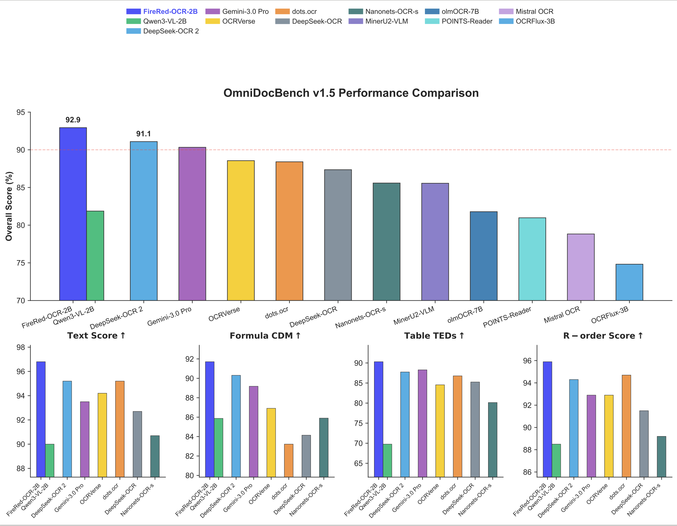 FireRed-OCR模型,该模型基于Qwen3-VL-2B架构,在文本识别、公式解析及表格重构等关键指标上全面领先。