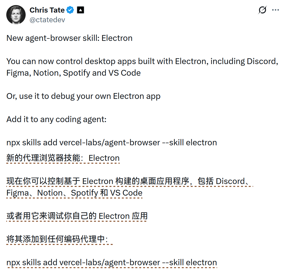 agent-browser 上线了 Electron 新技能,允许 Agent 绕过视觉识别,通过直接读取 HTML 来控制 Discord、Figma 及 VS Code 等桌面应用。开发者现可通过一条