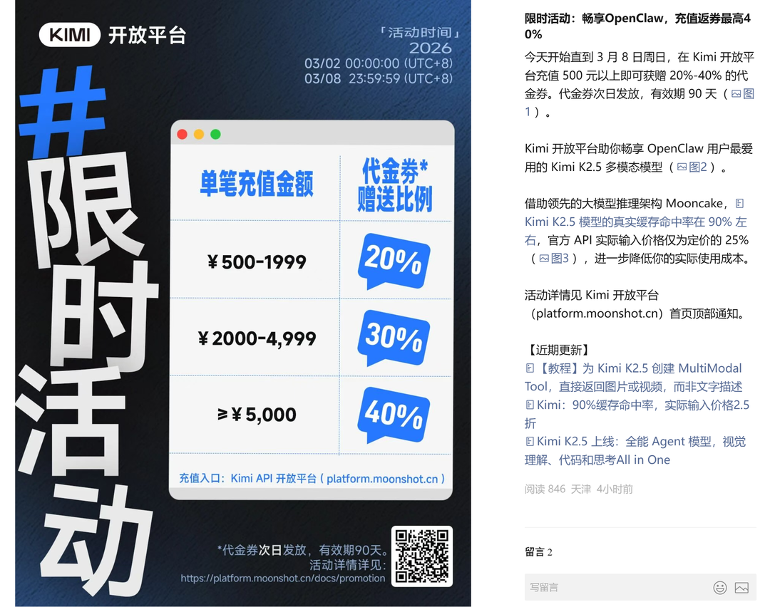Kimi开放平台宣布即日起至3月8日推出限时充值活动,用户充值达到不同档位数额可获赠对应20%至40%代金券,券于次日发放且有效期90天。活动重点推广Kimi K2.5多模态模型,得益于Mooncake架构,该模型缓存命中率约90%,使API实际输入价格仅为原定价的25%。