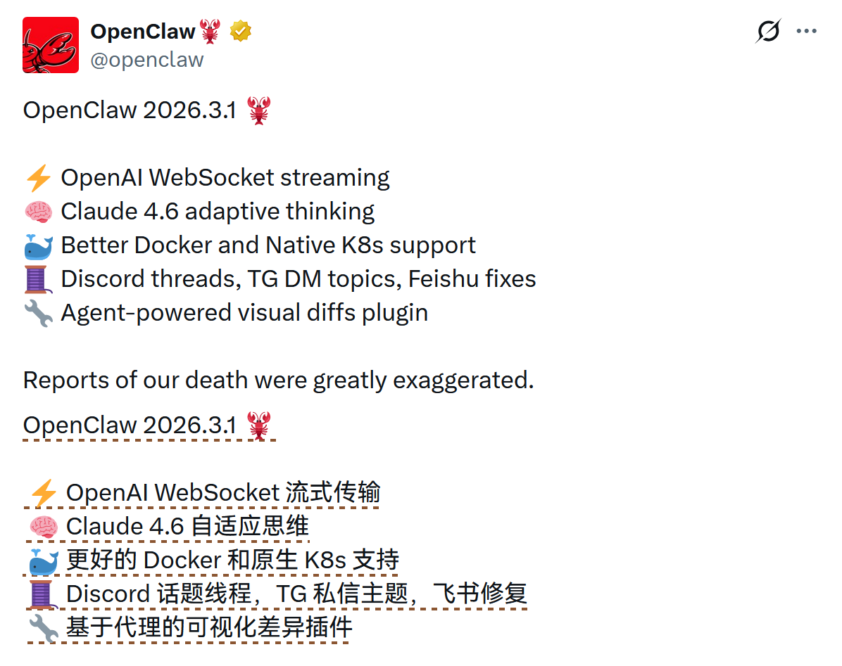 OpenClaw 正式发布 2026.3.1 版本,新版本引入 OpenAI WebSocket streaming,支持 Claude 4.6 adaptive thinking,并显著优化了 Docker 及 Native K8s 体验。生态集成上,新增 Discord threads 支持,修复 Feishu 相关问题,并推出 Agent 驱动的 visual diffs plugin。此外,其 GitHub Star 数已超越 React。
