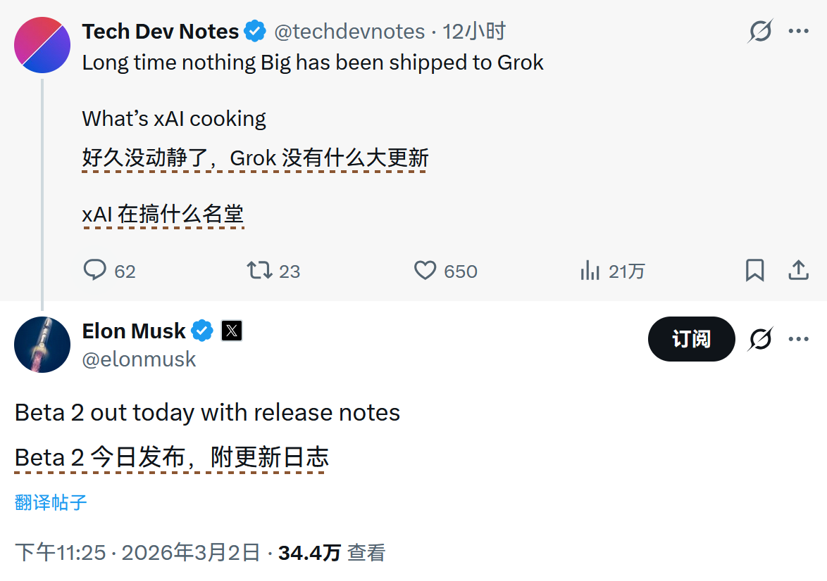 Grok 4.20 Beta 2将于今日发布,并将同步公开详细的版本说明。