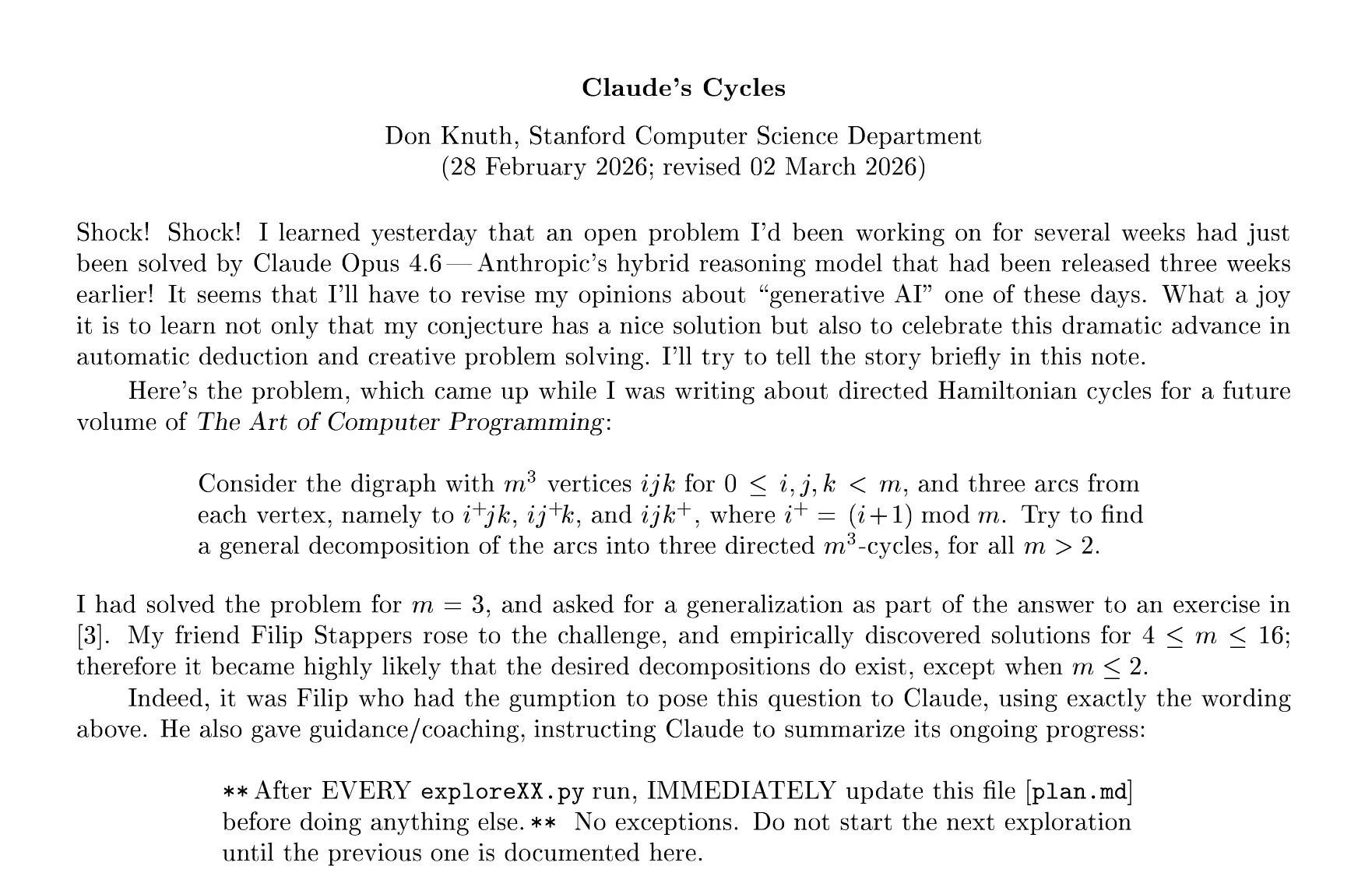 计算机泰斗高德纳发表论文《Claude's Cycles》,记录了Anthropic模型Claude Opus 4.6攻克一道三维网格图论难题的经过。该问题旨在寻找互不相交的哈密顿环,Claude Opus 4.6历经31次试错,利用“纤维分解”及“bump”规则发现了适用于奇数m的通用解法。高德纳验证了该解法的正确性,并指出存在760种变体。高德纳对AI展现出的推理能力表示震惊,认为这标志着AI在数学创造性求解领域的重大进步,预示着“人类提问、AI探索、人类证明”的新研究模式。
