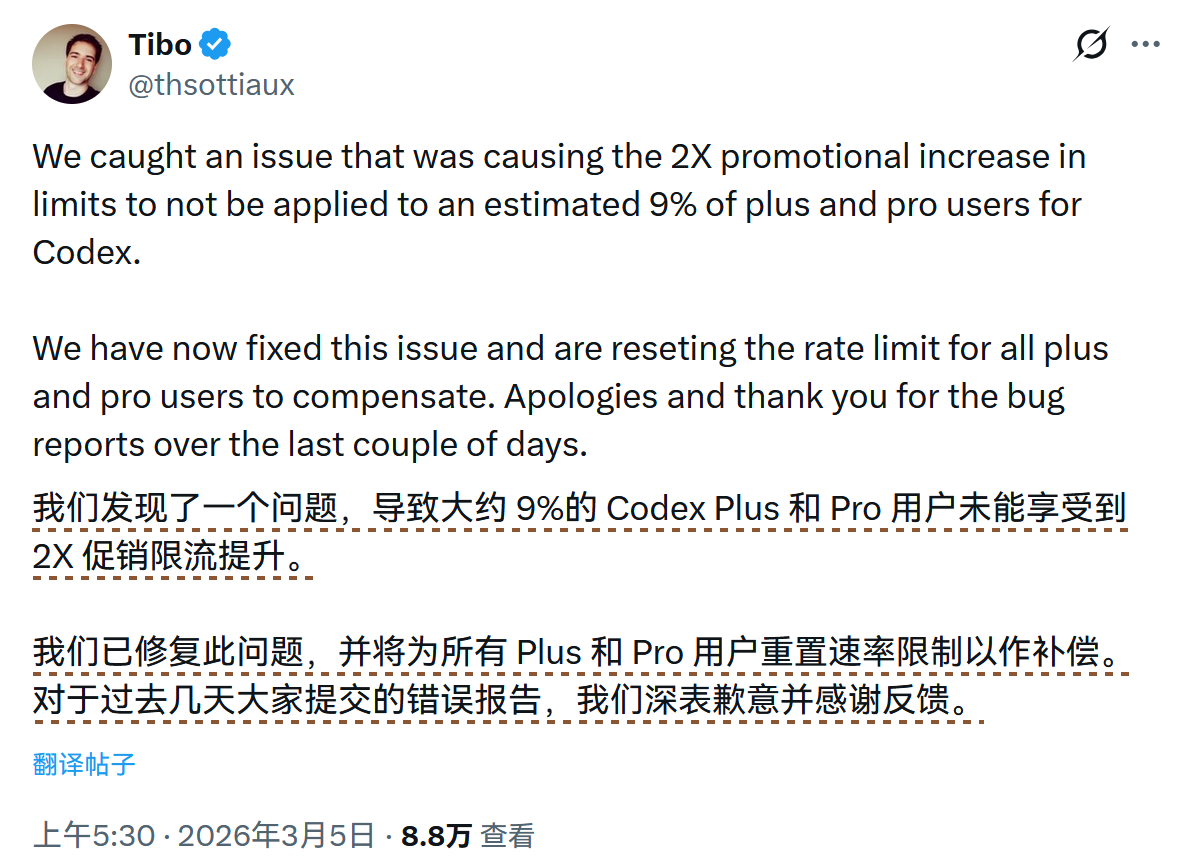 此外,官方今天早上修复了 Plus 和 Pro 用户 Rate Limit 未正确生效的问题,并重置了所有 Plus 和 Pro 用户的速率限制。