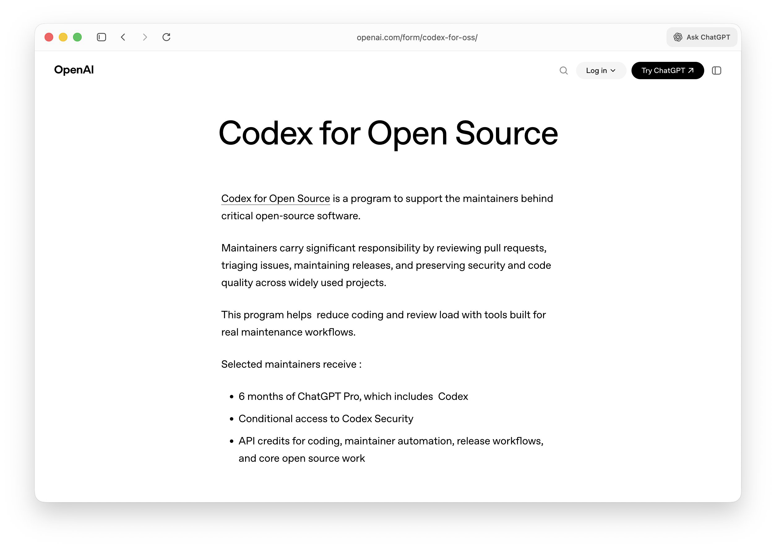 OpenAI推出**"Codex for Open Source"计划,基于此前设立的100万美元Codex开源基金,向开源项目核心维护者提供支持。该计划包含为期六个月的ChatGPT Pro订阅(含Codex**)、用于代码审查及自动化的API额度,以及有条件的Codex Security访问权。官方指出,基于GPT-5.4的能力,安全工具访问需经逐案审查。核心维护者及广泛使用的公开项目均可通过官网申请,若项目对生态重要即使不完全符合标准亦可提交说明。