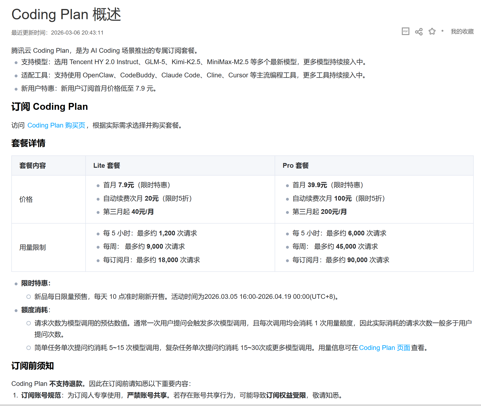 混元、智谱、Kimi及MiniMax等主流大模型,支持通过配置专属 API Key 调用。该套餐分为 Lite 与 Pro 两档,新用户首月特惠价分别为 7.9元 和 39.9元。