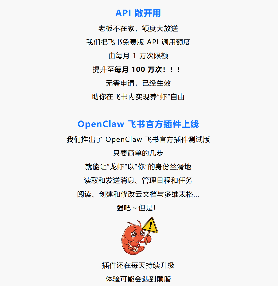 飞书升级免费版API调用额度并推出官方OpenClaw插件 #8
