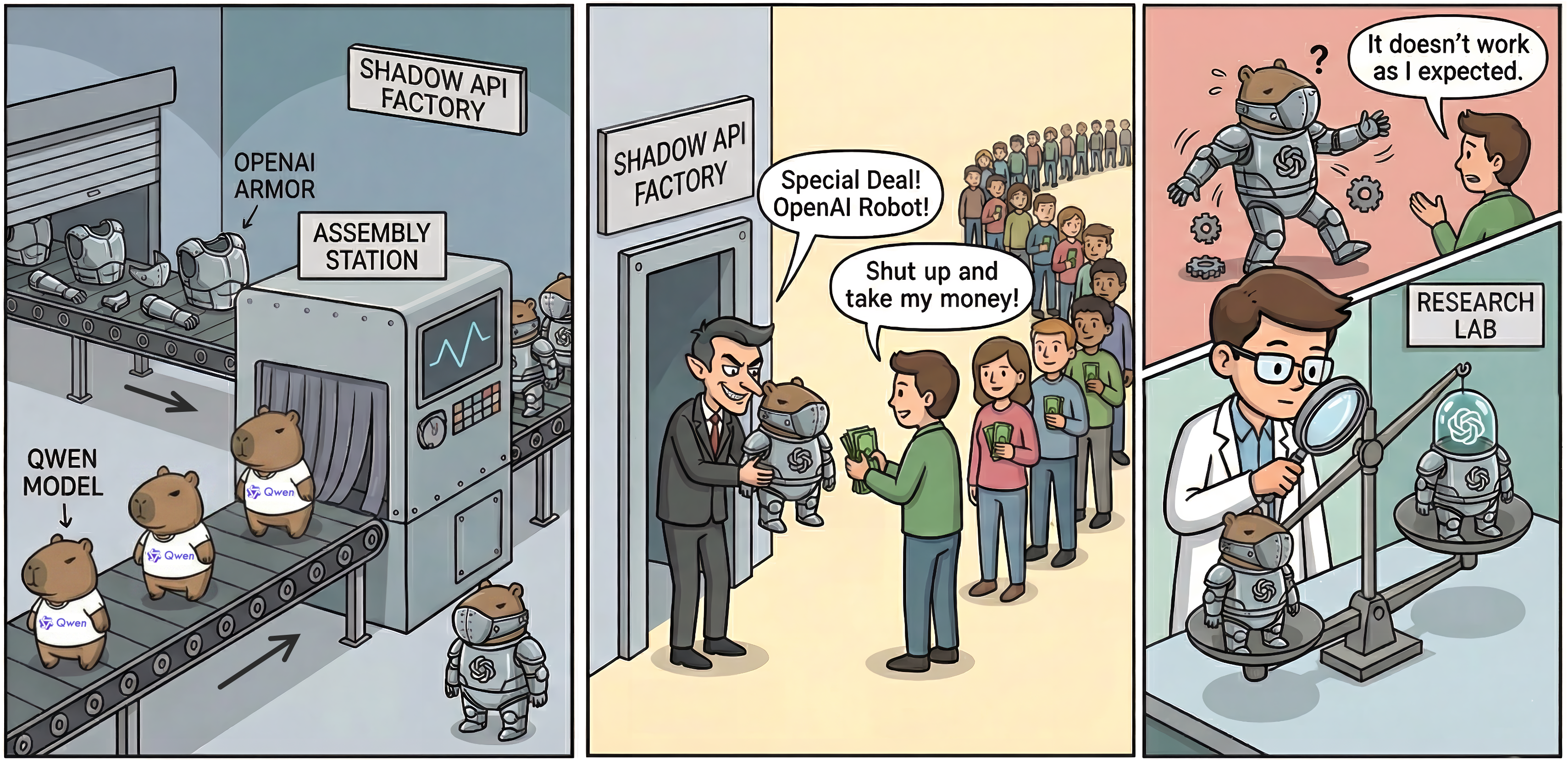 研究人员发布论文揭露大语言模型“Shadow API”市场存在严重欺诈,审计发现近半数第三方中转服务存在“偷梁换柱”现象。这种欺诈导致模型性能断崖式下降,研究建议立即停止使用此类服务。
