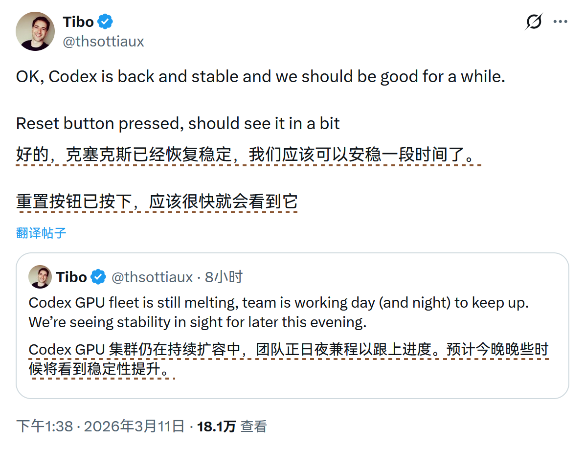 Codex 因 GPU 集群高负载进行了紧急维护,并已于北京时间 3月11日 下午重置速率限制作为补偿。