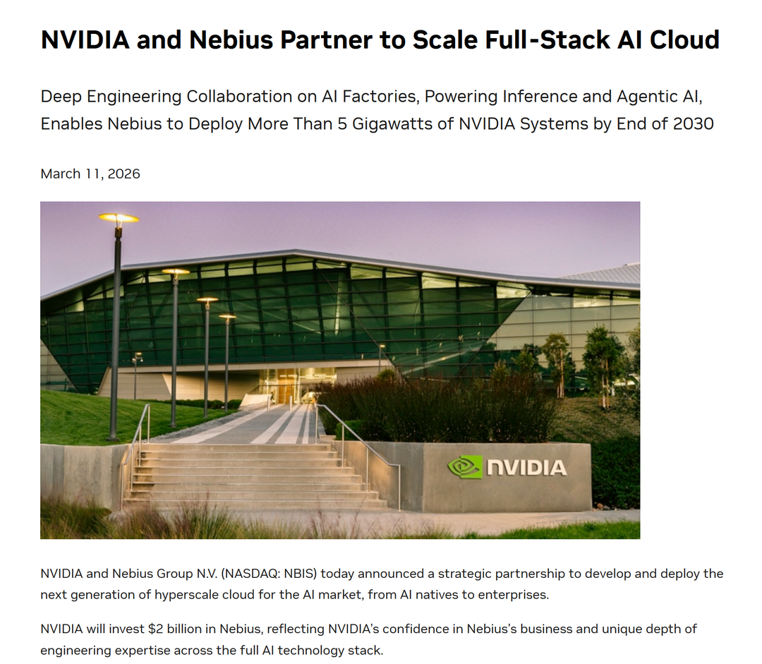 #21 - NVIDIA 注资 20 亿美元携手 Nebius 部署 5 吉瓦 AI 系统 ↗