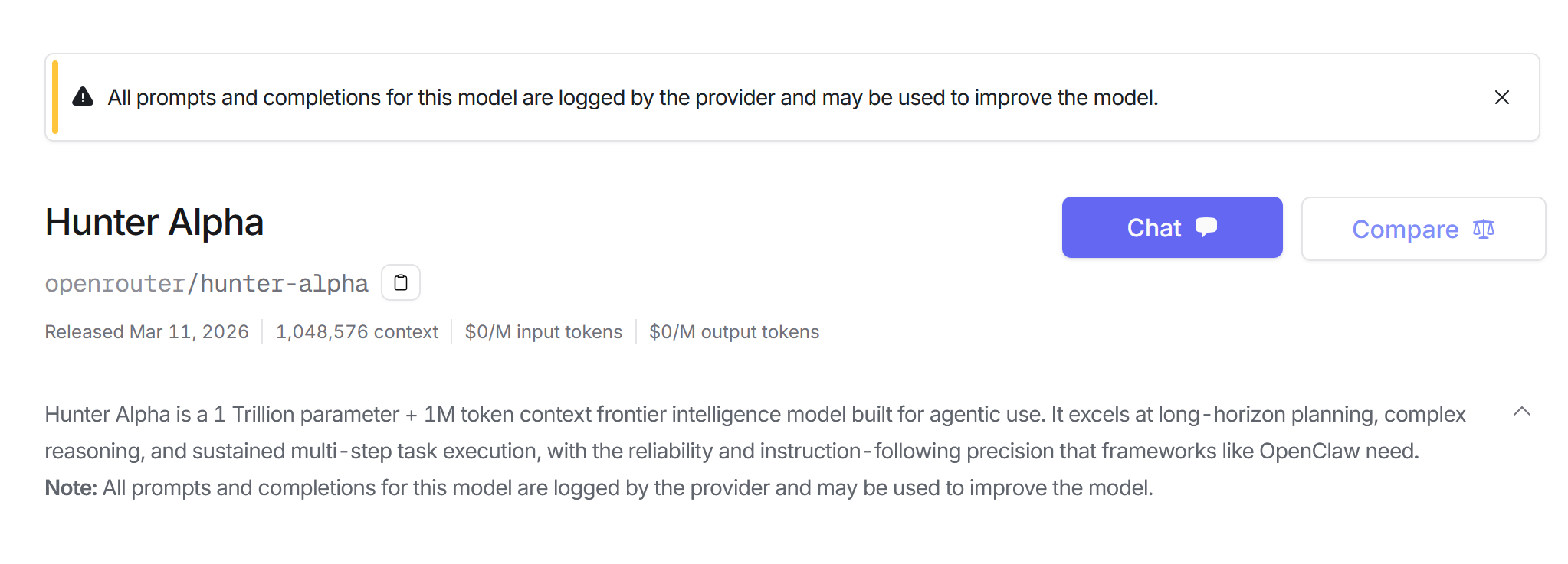 两款模型目前均提供免费调用,上述模型由 “Stealth” 提供商支持,所有提示词可能被记录。