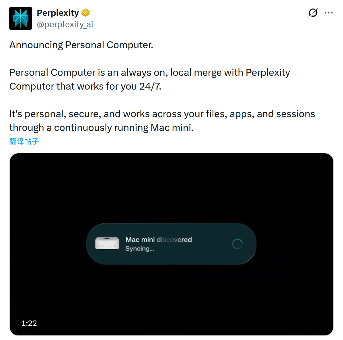 Perplexity 官方宣布推出名为 "Personal Computer" 的新产品,这是一款基于 Mac mini 持续运行的智能体。