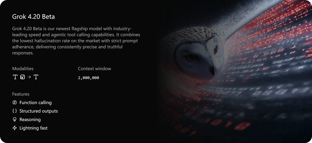 xAI 通过 API 上线三款 Grok-4.20 系列 Beta 模型,涵盖非推理、推理及多 Agent 协作版本。该系列支持 200 万 token 上下文窗口,在保持高速运行的同时引入 Agentic 工具调用能力,并针对降低幻觉率与提示词遵循进行了优化。