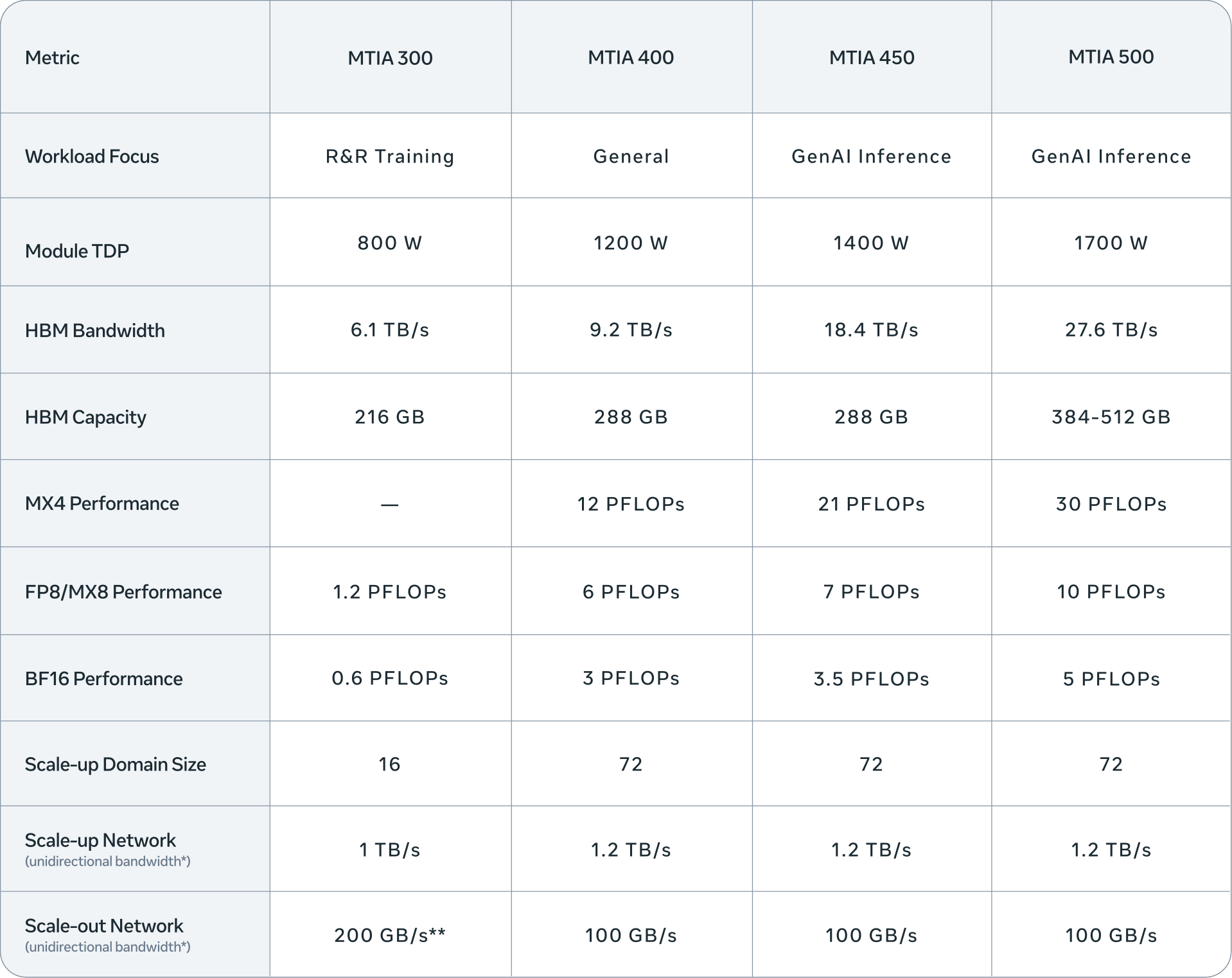 其中,MTIA 300 已投入推荐模型训练;MTIA 400 正部署至数据中心;MTIA 450 与 MTIA 500 计划后续部署,重点优化 GenAI 推理,后者 HBM 带宽与容量分别提升 50% 和 80%。