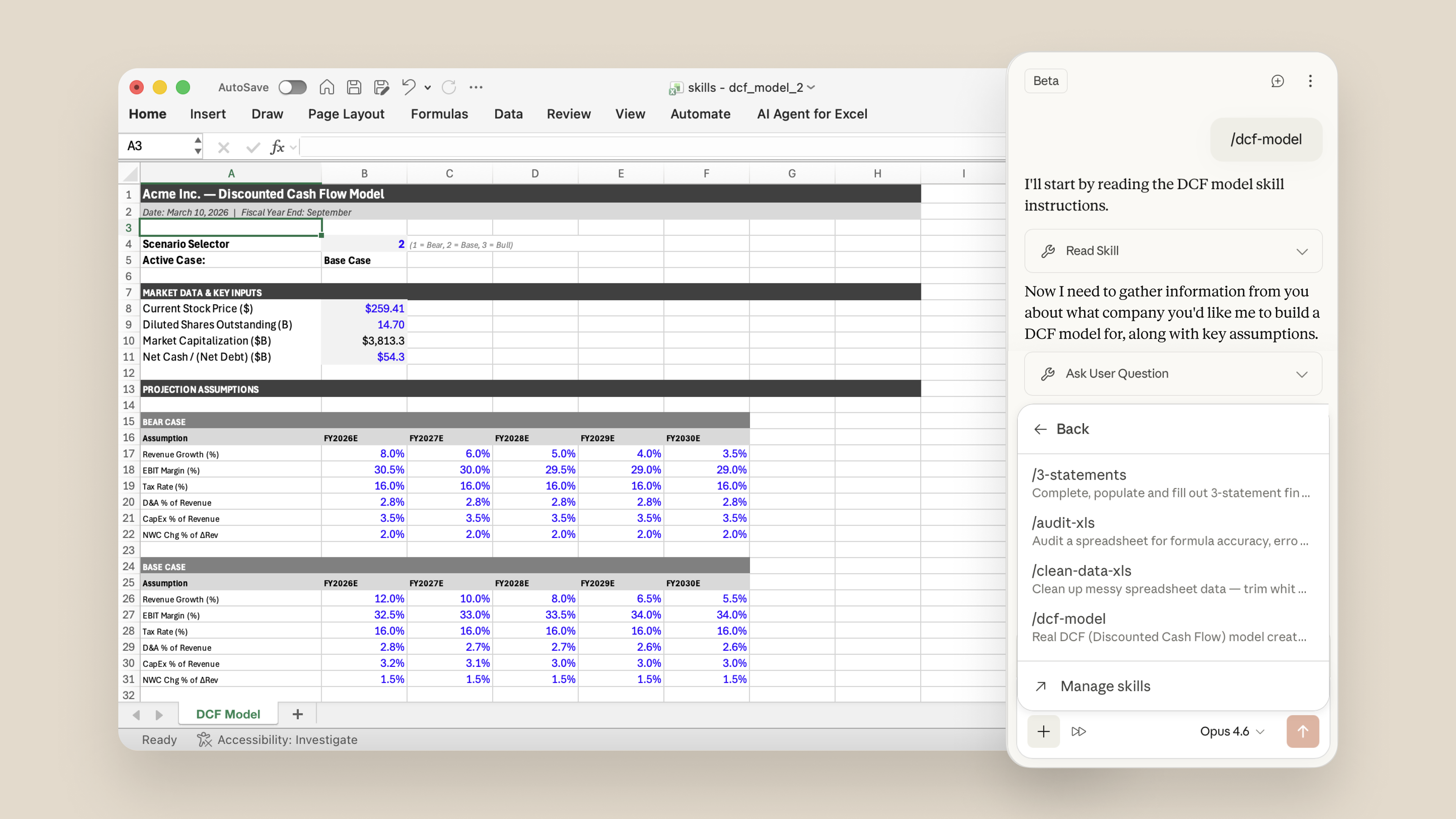 此外,官方引入“Skills”功能,将财务分析等最佳实践封装为可复用的一键操作,并预置了涵盖 LBO、DCF 等模型构建的技能包。