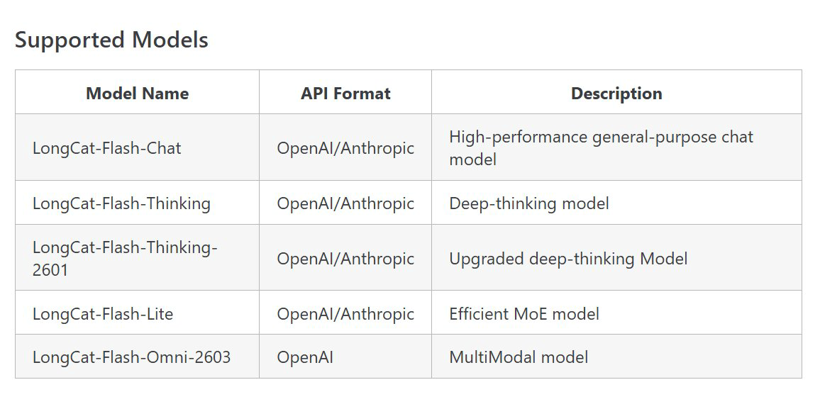 LongCat-Flash-Omni模型的 API。 同时,LongCat-Flash-Thinking接口已无缝升级至 2601 版本。