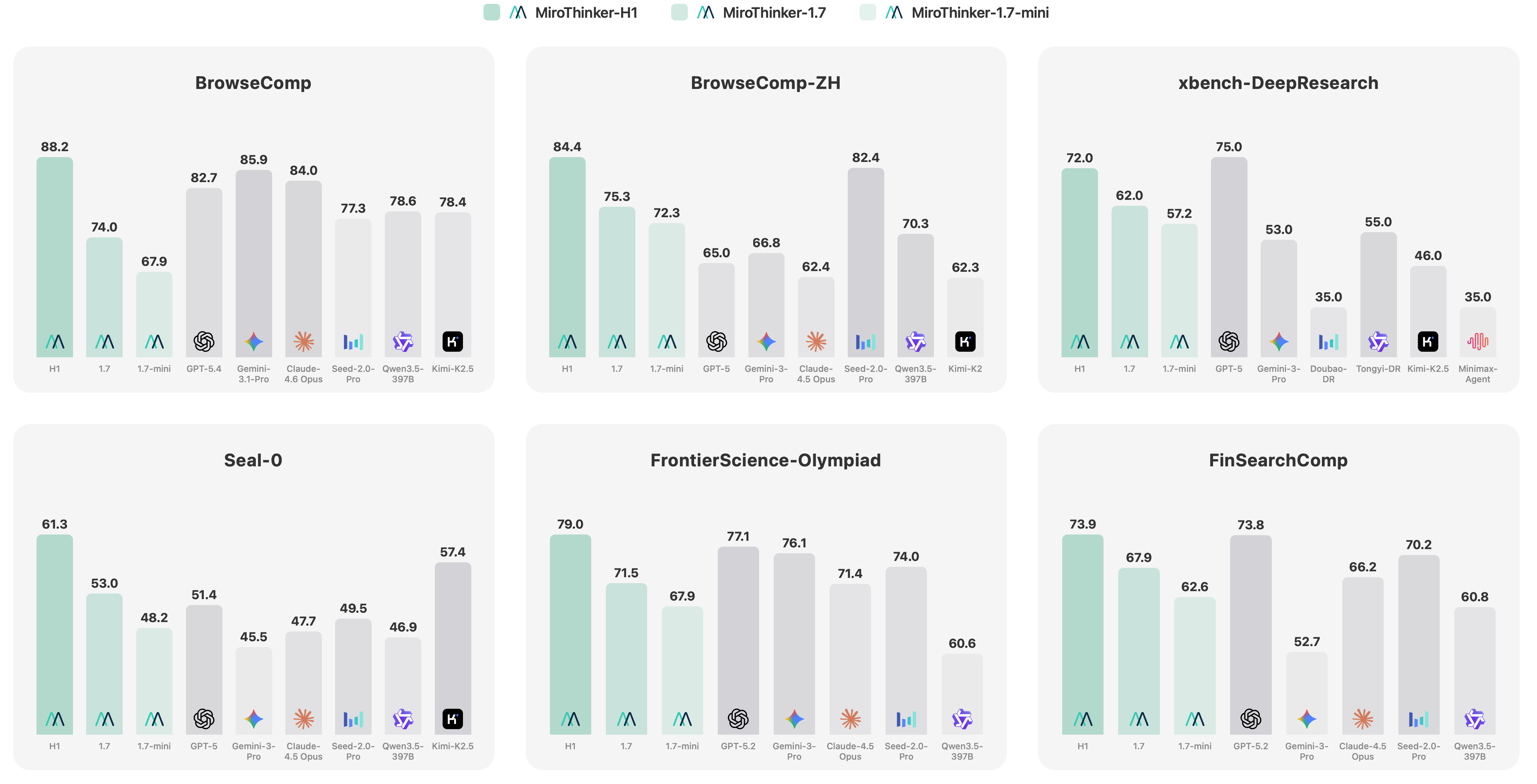 Qwen3架构的 MiroThinker 1.7 及其 mini 版开源模型,以及专有的定制化 Agent MiroThinker-H1。该系列模型支持