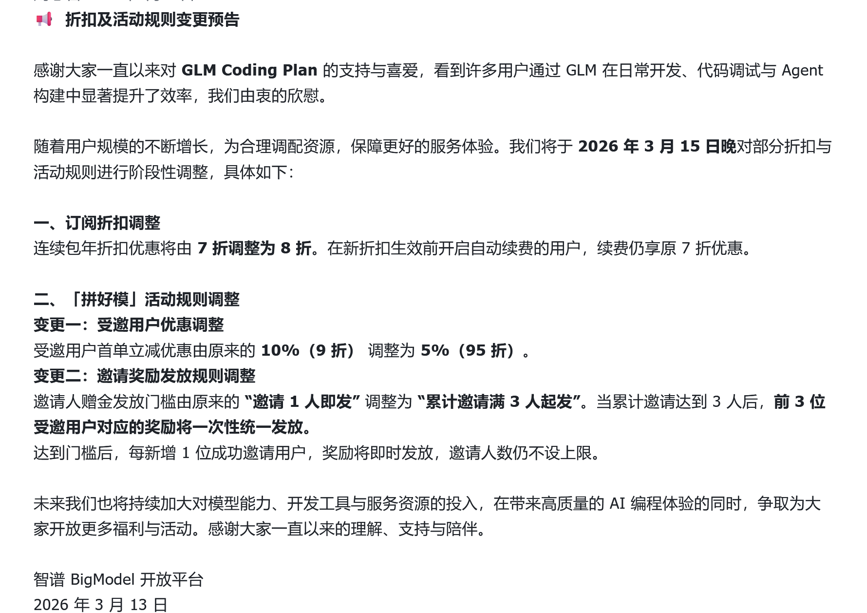 智谱宣布将于 3月15日 晚调整 GLM Coding Plan 资费规则,连续包年折扣缩减至 8折,但在生效前已开启自动续费的老用户可保留原优惠;同时“拼好模”活动的首单立减降至 5%,且邀请奖励发放门槛提升至 3人。