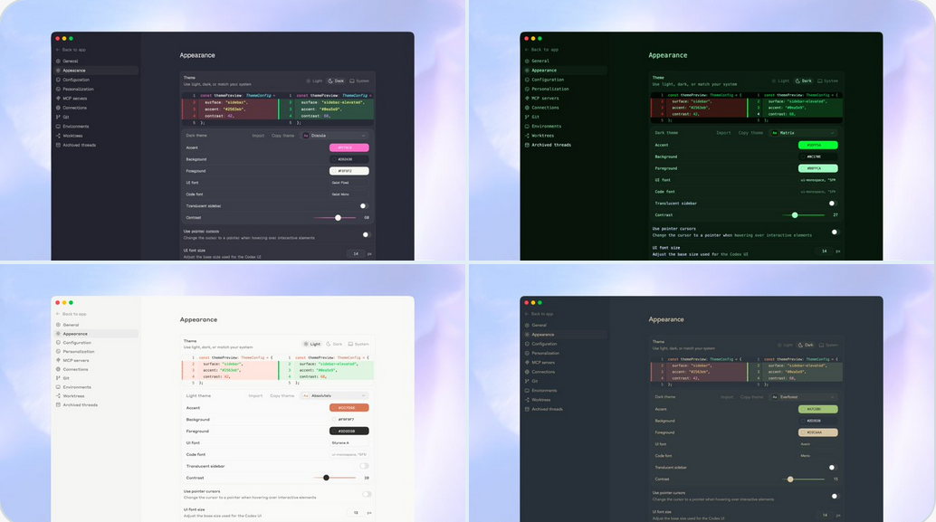 此外,官方还推出了 Codex 应用的主题个性化功能。用户现可导入或分享自定义主题,以实现界面个性化配置。