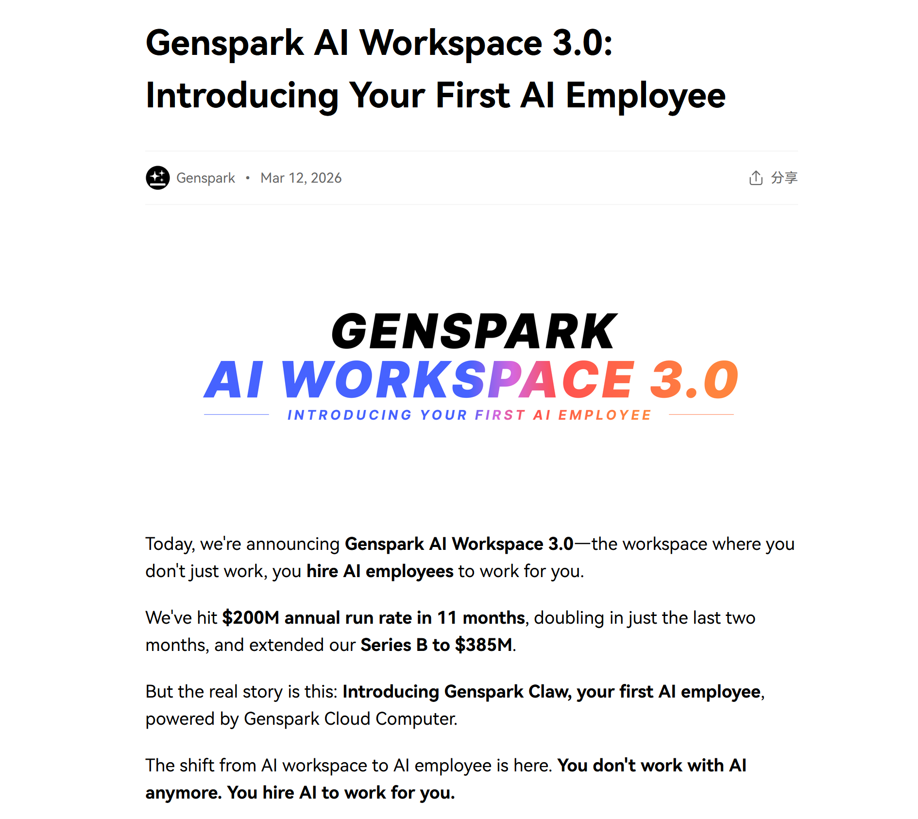 #10 - Genspark 发布 AI Workspace 3.0 ↗