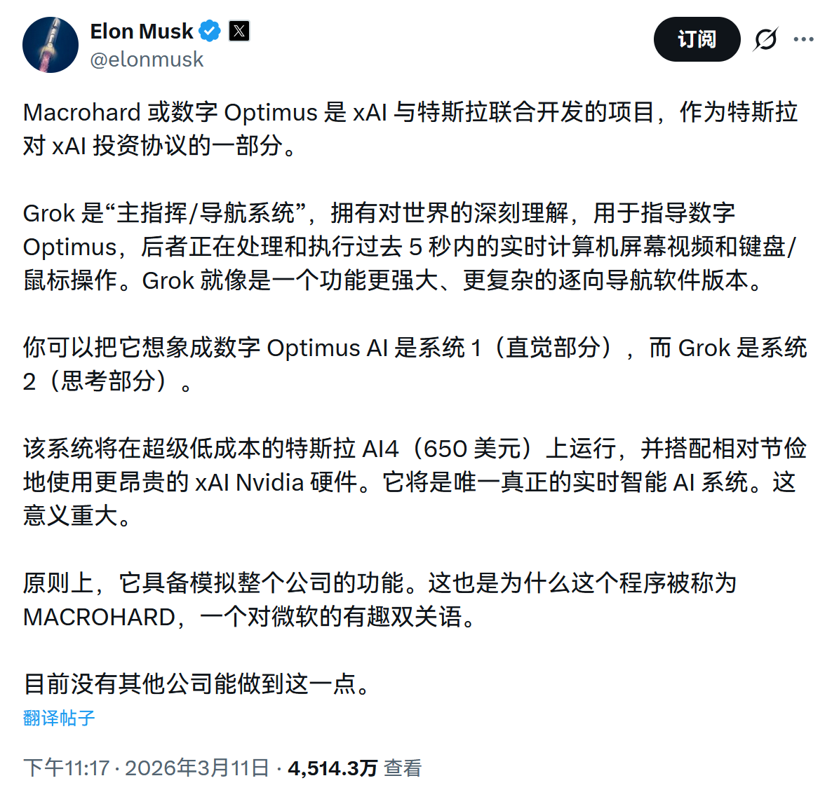 特斯拉与 xAI 联合宣布启动代号为 “Digital Optimus”(数字擎天柱)或戏称为 “Macrohard”(巨硬)的重大合作项目。这是继特斯拉此前向 xAI 投资 20 亿美元 后的首个重大开发成果,旨在构建一个能够通过观察电脑屏幕并模仿人类动作来自动化复杂办公室工作的系统,其最终目标为模拟整个公司的职能,处理会计、人力资源等高重复性任务。