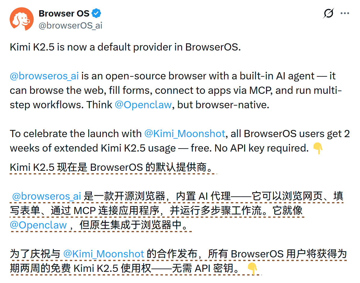#11 - BrowserOS 宣布 Kimi K2.5 为默认提供商,开启 2 周限免 ↗