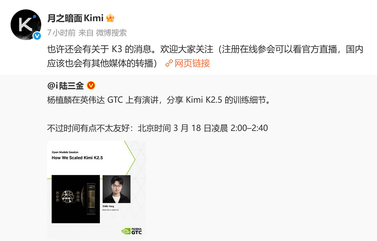 杨植麟将于英伟达 GTC 演讲,或披露 Kimi K3 信息 #19
