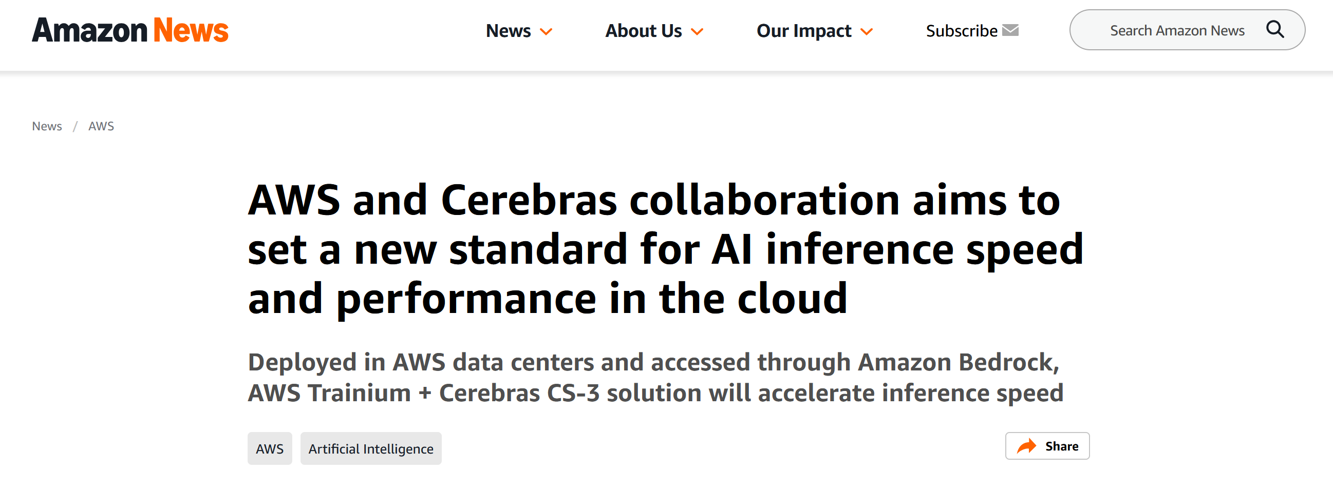 - AWS 携手 Cerebras 整合 Trainium 与 CS-3,加速 AI 推理服务 ↗