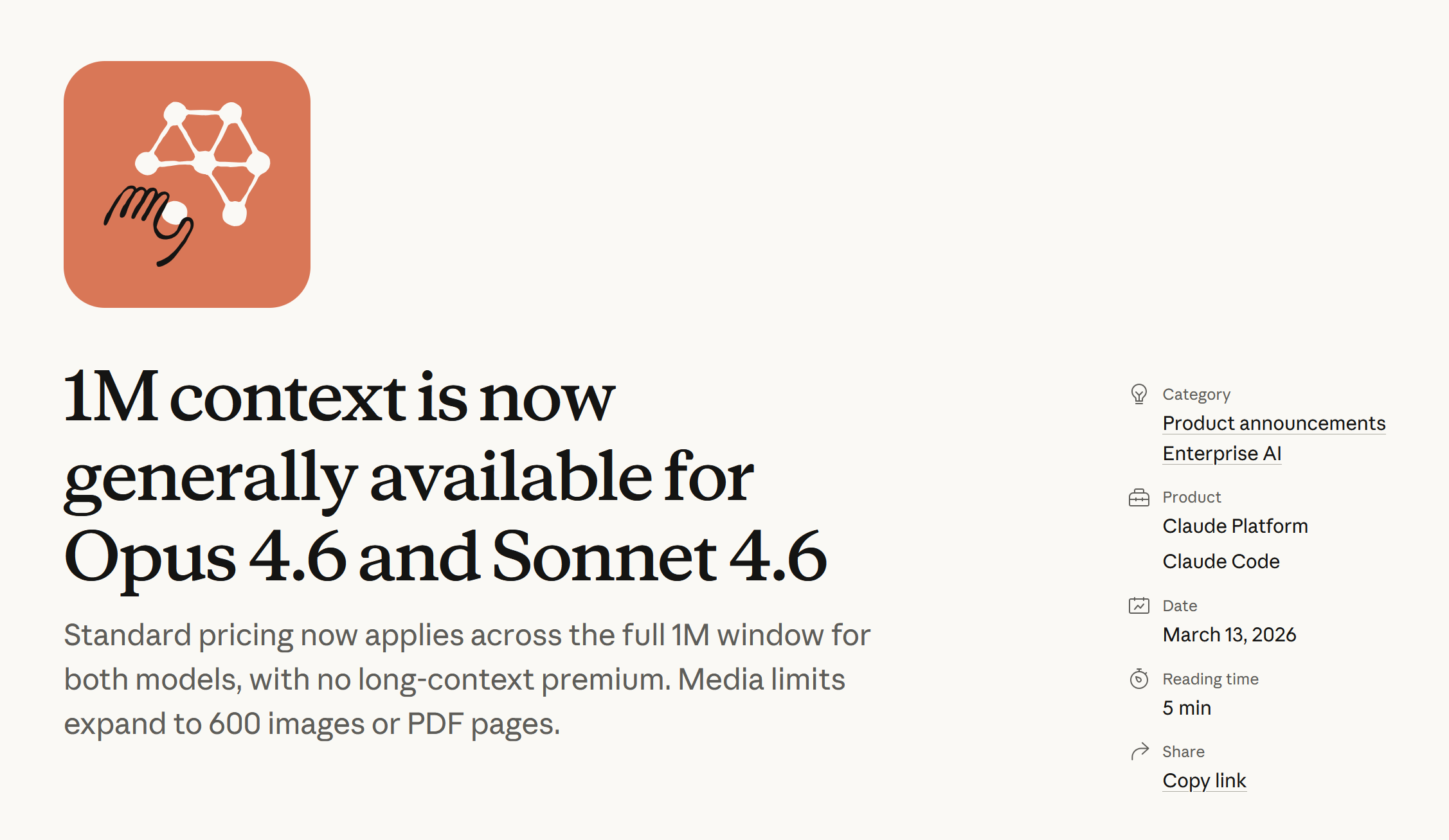 - Claude 正式开放 100 万 token 上下文,取消阶梯定价 ↗