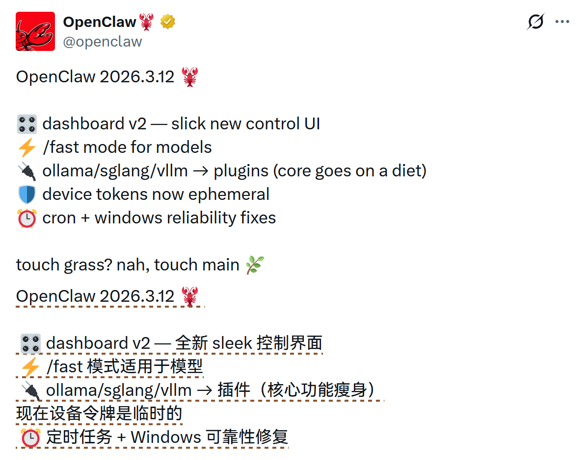 OpenClaw 发布 v2026.3.12,推出 Dashboard v2 调整架构 #9