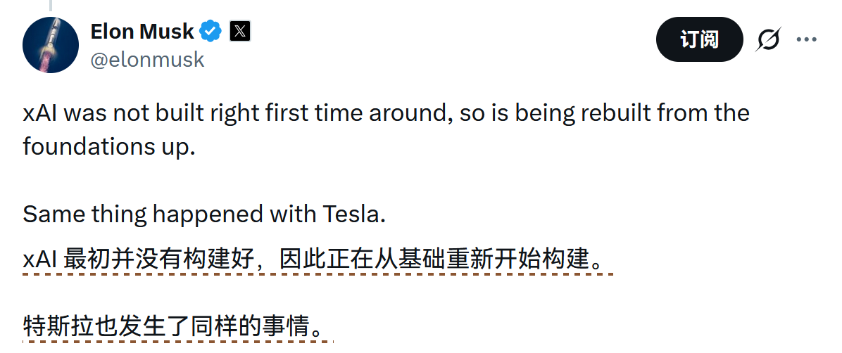 Elon Musk 承认旗下 xAI 初创架构存在根本缺陷,正从基础开始彻底重建。
