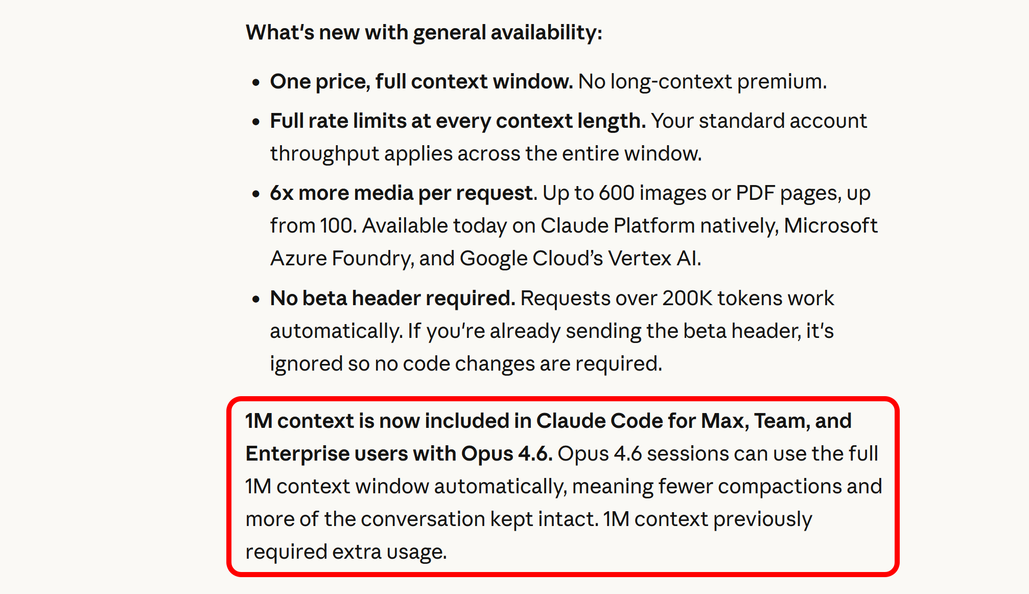 Opus 4.6时将默认启用 100 万 上下文窗口。