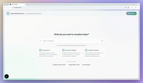 该项目基于 CopilotKit 和 LangGraph 技术,允许 Agent 生成算法可视化、3D 动画及图表等组件,内容通过沙箱 iframe 渲染以确保安全。