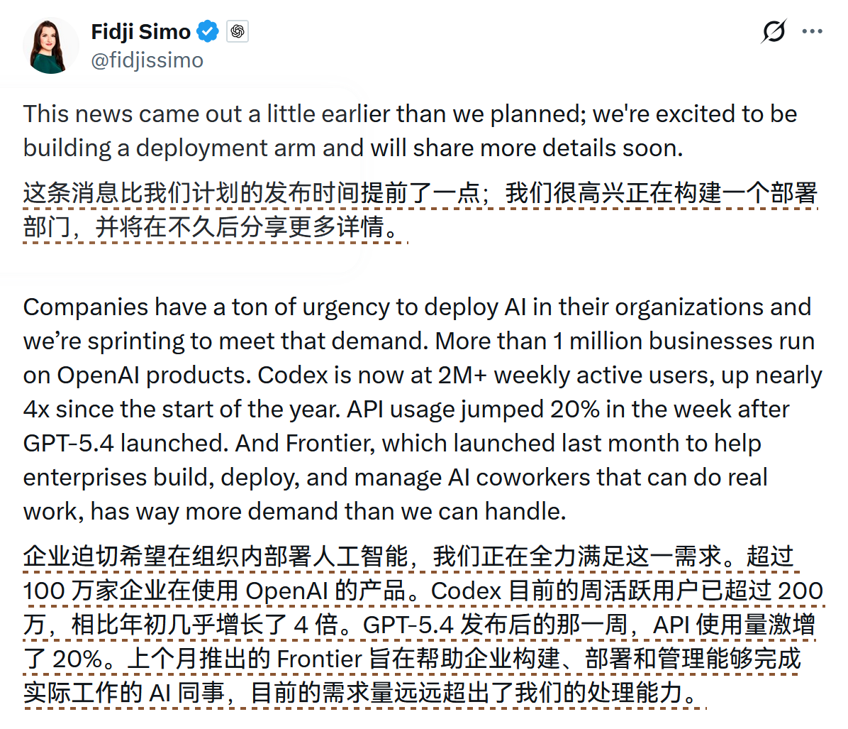对此,OpenAI 应用程序 CEO Fidji Simo 证实公司正在构建一个专门的“部署部门”,并透露目前已有超过 100 万 家企业使用其产品。