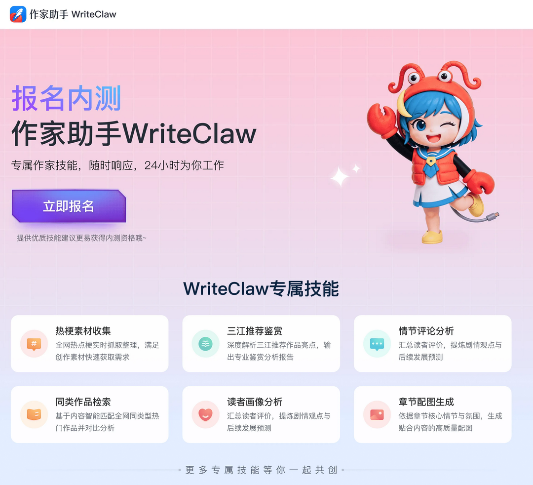 阅文集团旗下“作家助手”宣布 WriteClaw 正式开启内测,旨在打造集编辑与运营职能于一身的“超级助理”,进一步降低网文创作与运营门槛。