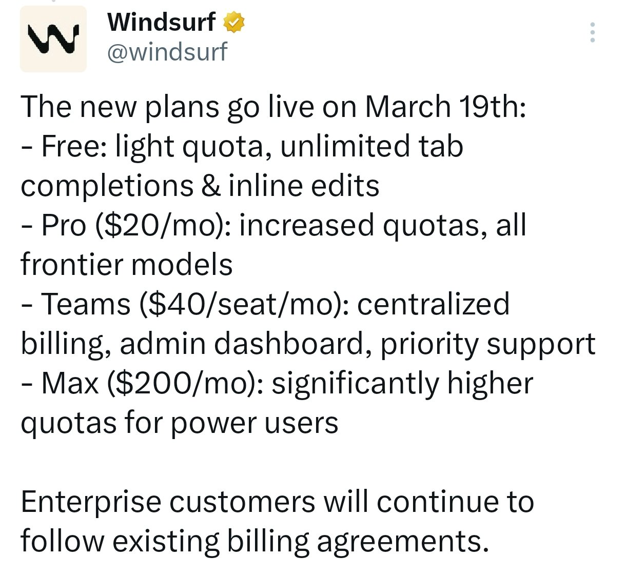 #7 - Windsurf 启用新定价,推出 200 美元 Max 计划 ↗