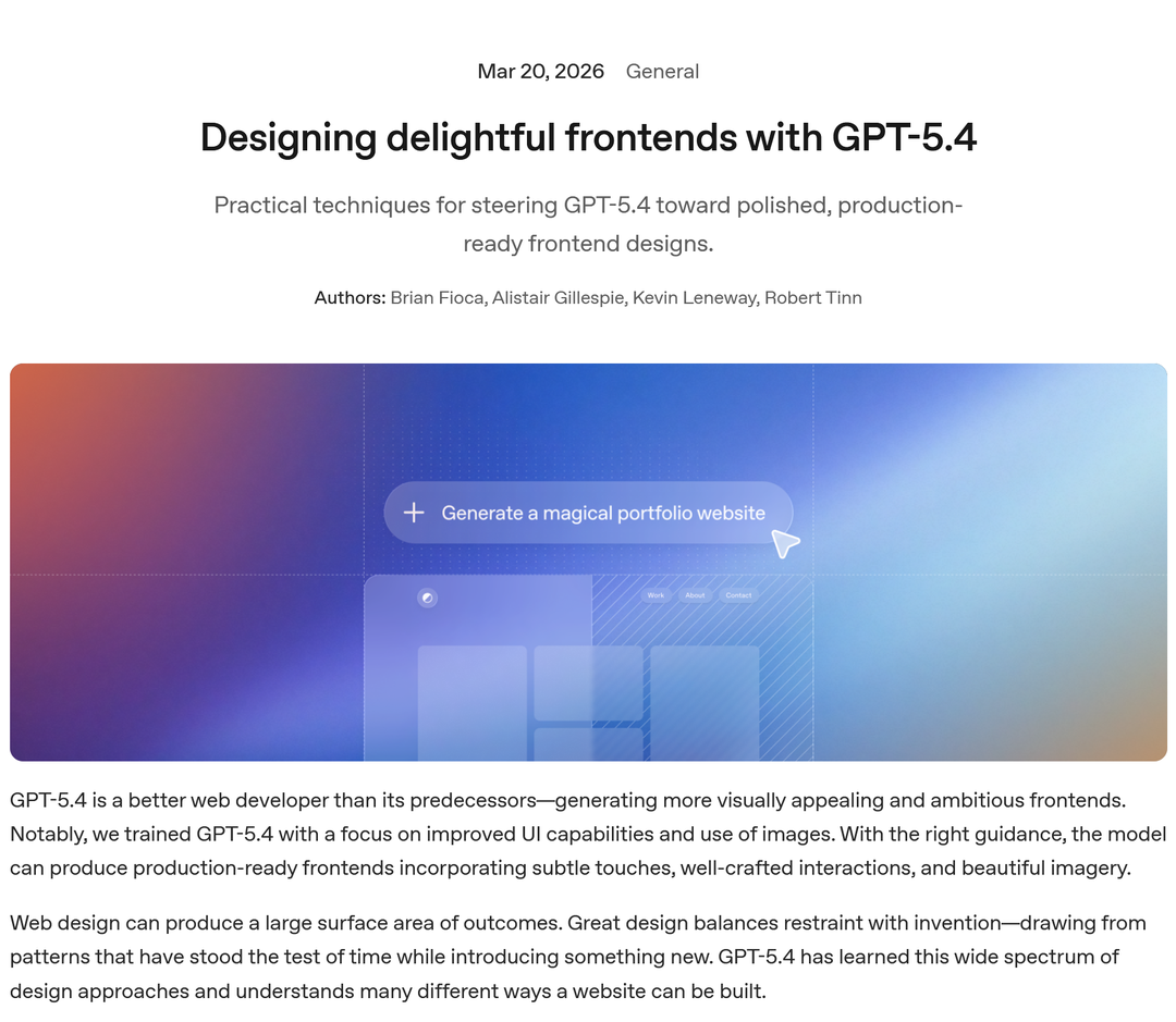 - OpenAI 发布 GPT-5.4 前端设计指南,推出配套 frontend-skill ↗