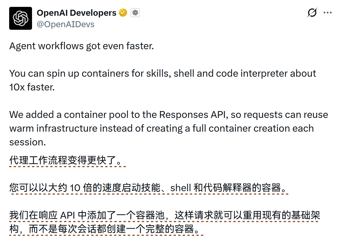 OpenAI Developers 发文详细阐述了基于 Responses API 的 Agent 执行层构建路径,并宣布通过引入容器池技术,将 Skills、Shell 和 Code Interpreter 的容器启动速度提升了约 10 倍,使请求能够复用热基础设施而非每次会话都创建全新容器。