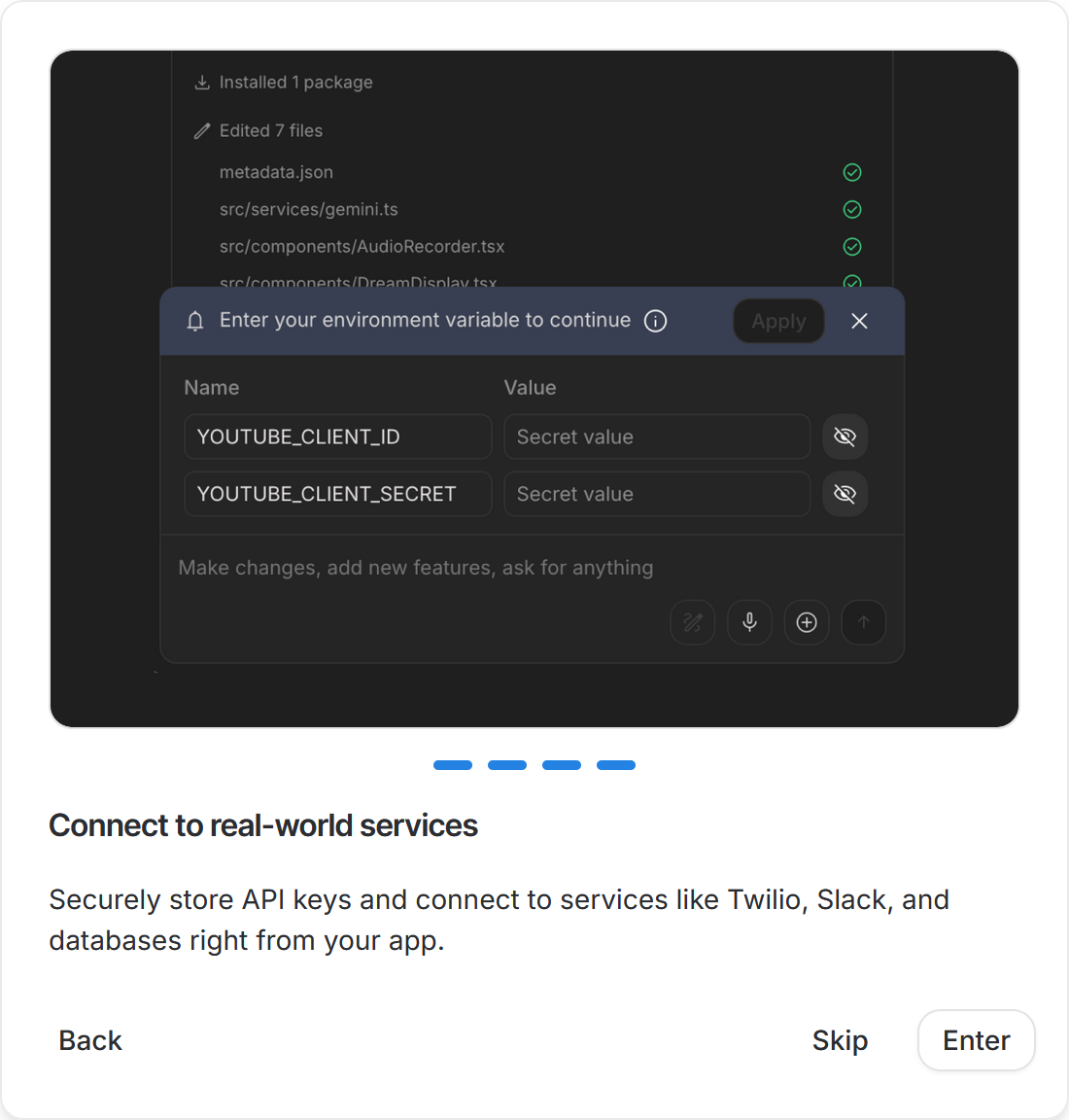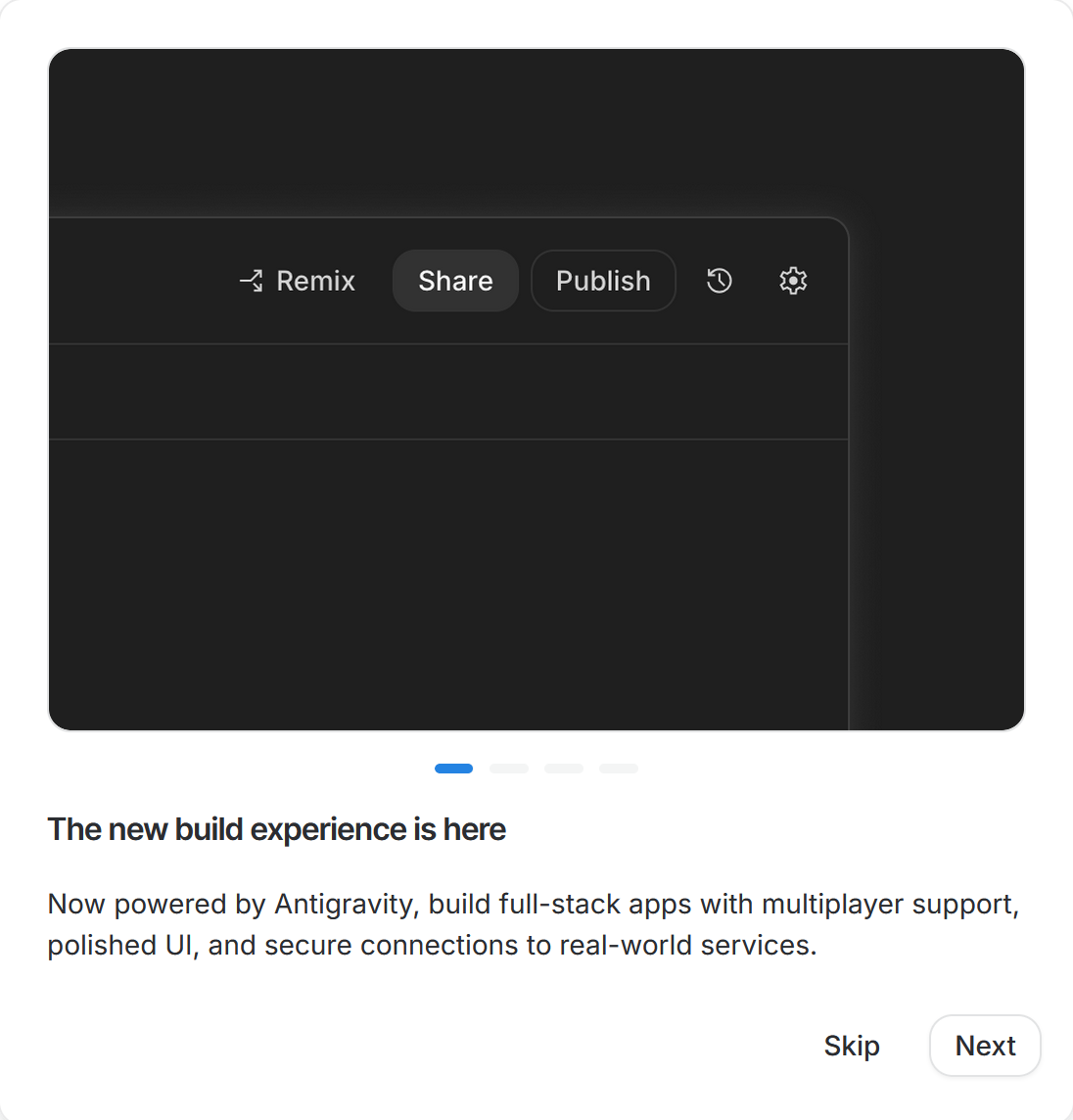 Antigravity驱动的全新Build体验,支持开发者从单一提示词快速构建生产级全栈应用。新功能不仅集成了Lucide React和Framer Motion以实现专业UI,还通过新增的认证层和集成标签页,实现了对OAuth、外部 API以及 Twilio 和 Slack 等服务的安全连接。